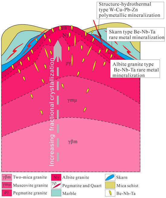 The Lalong albite granite-type Be–Nb–Ta rare metal ore bodies are hosted by albite granite and pegmatite, which are also plotted in the magmatic–hydrothermal domain, suggesting that albite granite and pegmatite not only experienced the magmatic process, but also experienced the magmatic–hydrothermal transition process as well as a later hydrothermal process. Be–Nb–Ta rare metal in the magmatic stage generates the pre-concentrations and preliminary enrichment and can be hydrothermally redistributed to form large economic deposits during the magmatic–hydrothermal stage (Figure 17).