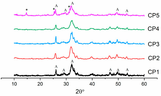 According to XRD data after the synthesis, the only phase in CP1–CP4 materials was HA (ICDD PDF-2 No. 000-09-0432) (Figure 1). When 12 mol.% of sulphate groups was introduced (CP5), another phase appeared: CS hemihydrate (ICDD PDF-2 No. 000-01-0999). All the powders were characterised by low crystallinity.