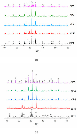 Diffractograms of samples heat-treated (a) at 900 °C or (b) at 1200 °C. β: β-TCP, α: α-TCP, A: hydroxyapatite, and П: Ca2P2O7.