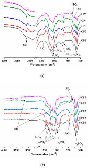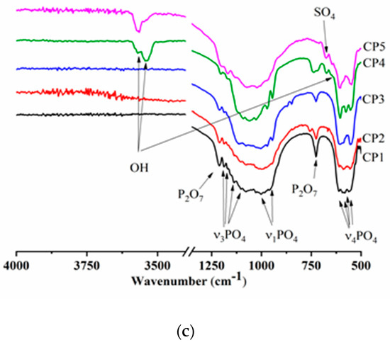 According to FTIR spectroscopy of the synthesis products (300 °C), there were hydroxyl group bands at 3571 and 633 cm−1, meaning the formation of HA [41] (Figure 3a). Bands of the PO43− group were also characteristic of the HA profile [42]. For instance, in the FTIR spectra, doublet ν4 was observed at 563 and 602 cm−1, ν3 in the frequency range 1027–1111 cm−1, and ν1 at 960 cm−1. With an increase in the sulphate group content, the intensity of the peaks declined. The absorption region with a wave number of 870 cm−1 belongs to HPO42−. In addition to phosphate groups, there is a peak affiliated with the NO3 groups related to by-products of the reaction: e.g., ammonium nitrate [43]. The peak at 1209 cm−1 is typical for CO groups associated with heat treatment of synthesis products [44]. It is especially noteworthy that CP5 features a shoulder characteristic of SO4 groups in the region of 670 cm−1, thereby confirming XRD data of other researchers on the formation of the CS hemihydrate phase [45].