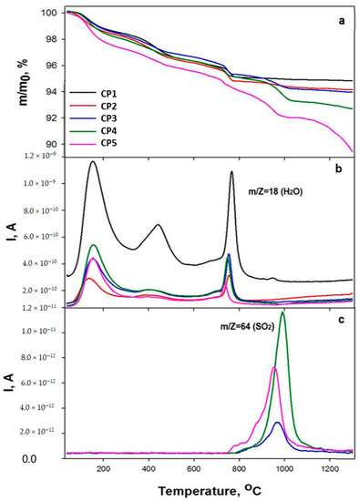 Synchronous thermal analysis was performed on a Netzsch STA 409 PC Luxx (Netzsch, Selb, Germany) thermal analyser at a heating rate of 10 °C/min. Sample weight was at least 10 mg. Analysis of the composition of the gas phase resulting from the sample decomposition was carried out by means of a Netzsch QMS 403C Aëolos (Netzsch, Selb, Germany) quadrupole mass spectrometer coupled with a Netzsch STA 409 PC Luxx thermal analyser. Mass spectra were recorded for molecular weights 18 (H2O) and 64 (SO2).