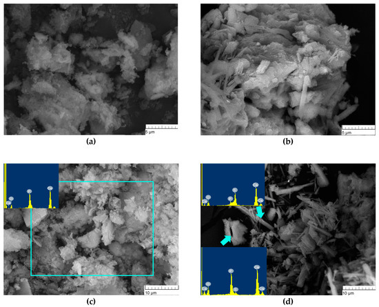 The morphology of the CP1 sample after the heat treatment at 900 °C featured agglomerates with a loose structure. EDA uncovered the presence of Ca, P and O at a Ca/P ratio of ~1.61 (Figure 6a) as in the case of 300 °C heat-treated products. The particles of CP5 were characterised by the presence of needle-like and flake-like crystals. The EDA findings suggested that the intensity of S and P peaks became similar for all examined zones, implying homogenisation of the chemical composition during the heating. Therefore, the powders consisted of elements Ca, P, S and O, in agreement with ref. [29], where powders were heat-treated at 1000 °C (Figure 6b).