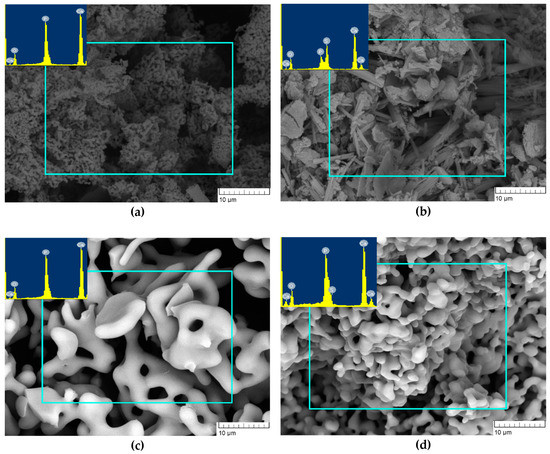 After the heat treatment at 1200 °C, the powders of CP1 and CP5 featured the assembly of consolidated porous structure. The pore size in CP1 lay in the range of 2–5 µm, whereas CP5 pores had a size of up to 1 µm (Figure 6c,d). EDA of CP1 uncovered the presence of Ca, P and O, and the Ca/P ratio was 1.66, whereas CP5 manifested the presence of an S peak of very low intensity, suggesting that SO4 persisted in CP5.