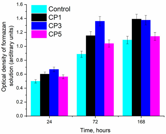 Figure 7 shows histograms of the samples for different time points of MG-63 osteosarcoma cell cultivation, suggesting that the fastest cell growth was observed on CP3 for all cultivation periods. This finding is due to the lower solubility of CP3 compared to CP5, which retained CS. It is known that the presence of CS enhances the solubility of β-TCP [53]. Overall, the results of our experiments in vitro indicate the cytocompatibility of both pure β-TCP and samples of β-TCP containing sulphate groups. On the other hand, more pronounced matrix properties in relation to MG-63 cell culture were revealed in the CP3 sample. The high solubility of β-TCP is detrimental to cells due to a sharp release of calcium ions into the medium [54] (Table 5).