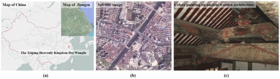 (a) The location of the Taiping Heavenly Kingdom Prince Dai’s mansion (the red dot), situated in Jintan County, Changzhou, Jiangsu Province; (b) Satellite image of the location of Dai Taiping Heavenly Kingdom Prince Dai’s mansion (The red dot represents the location of the mansion); (c) The color painting executed on the wooden beams in Taiping Heavenly Kingdom Prince Dai’s mansion.