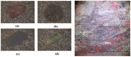 Four pigment samples (left) collected from the color painting (right) on the northern beam of the main hall in the mansion (a) red, (b) black, (c) blue, and (d) green pigment), as labeled with yellow dots.