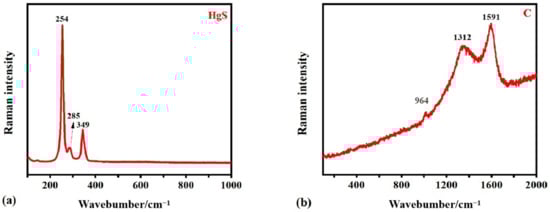 PLM was used to examine the red pigment samples, showing dark reddish color under horizontal polarized light (Figure 3a) or reddish orange under perpendicular polarized light (Figure 3b), suggesting that cinnabar might be present. This was further explored using other techniques. The Raman spectrum of the red pigment sample shows peaks at 254 cm−1 (vs), 285 cm−1 (w), and 349 cm−1 (w) (Figure 4). Comparing the Raman spectrum of the red sample with the standard spectrum, the peak at 254 cm−1 is attributed to the stretching vibrational band of Hg-S and the bands at 285 cm−1 (w) and 349 cm−1 (w) belong to the degenerate E modes, which can be assigned to the normal modes ELO and ETO [28], confirming the presence of cinnabar, which is consistent with the EDS results (Table 2). The lack of interference from the fluorescent background of the Raman spectrum indicates the high purity of the red pigment.