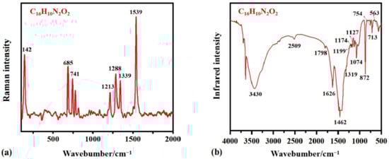 Given that element analysis for the blue pigment shows the presence of N, O, Ca, C, and Si (Table 2), it was initially speculated that the blue pigment might be smalt (potassium glass containing cobalt: 65% SiO2, 16%–21% K2O, and 6%–7% CoO with impurities Ba, Ca, and Fe), ultramarine [(Na,Ca)8(AlSiO4)6(SCl)2], or indigo (C16H10N2O2). The detected Ca (27.29%) and Si (0.5%) might be from impurities such as dust deposition on the painting surface. Additionally, the origin of Ca might be from the addition of calcium carbonate to the pigment, which is a common technology that increases the coverage rate. In order to further investigate the composition of the blue pigment sample, the Raman spectrum and FT-IR spectrum were collected, as shown in Figure 5a,b.