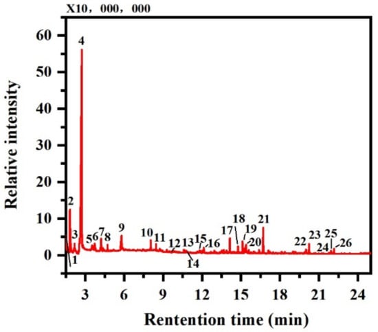 The Py–GC/MS consists of two parts. Parameters of the first part for pyrolysis (Frontier Labs EGA/PY−3030D Koriyama, Japan) include thermal cracking temperature, thermal cracking time, syringe temperature, and interface temperature of the syringe and chromatograph, which were set at 600 °C, 10 s, 250 °C, and 320 °C, respectively. The other part includes GC/MS (Shimadzu QP2010 Ultra, Kyoto, Japan) and a SLB−5MS chromatography column (5% diphenyl–95% dimethylsiloxane). The initial temperature of the oven containing the column was set to 50 °C, and this was held for 5 min. The temperature was then increased at a rate of 3 °C/min to a final temperature of 292 °C that was held for 3 min. The pre-column pressure, the flow rate, and the separation ratio were set at 15.4 kPa, 0.6 mL/min, and 1:100, respectively, and the ionization voltage, scan rate, and mass-to-charge ratio of the mass spectrometer were set at 70 eV, 0.5 s, and 50 to 750, respectively.