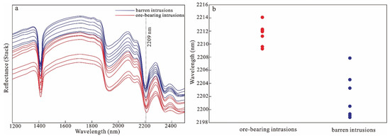 (a) SWIR spectra of white micas from ore-bearing intrusions and barren intrusions; (b) Statistical diagram of SWIR spectra absorption feature wavelengths (2198–2216 nm) for white micas from ore-bearing intrusions and barren intrusions.