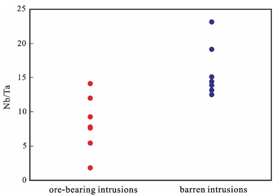 Among the trace elements of white micas in the study area, the overall content of rare earth elements is low, and most of them are below the detection limit (Table 2). The Nb/Ta ratio of white mica generally varies with the degree of magmatic evolution, and normally decreases with an increasing evolution trend [33]. The Nb/Ta value of white micas for the ore-bearing intrusions (1.72–14.06) in the study area were relatively smaller than the barren intrusions (12.78–23.08), indicating that ore-bearing intrusions may have a higher magmatic evolution (Figure 5).