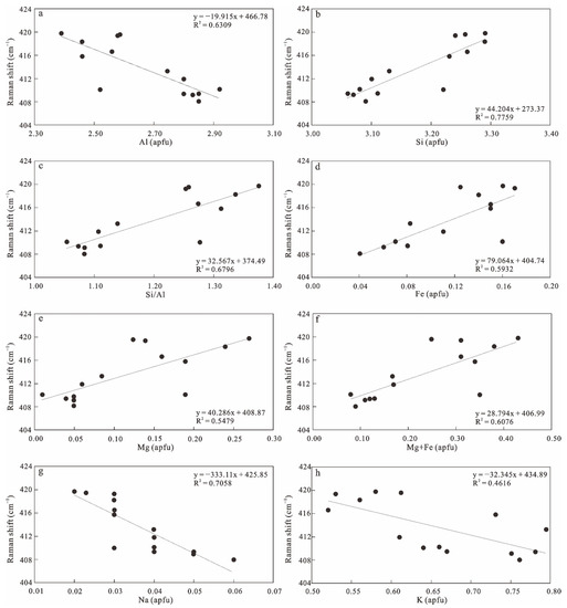 Binary diagram of Raman shift (Al, O (br)) for the Shimensi white micas vs. (a) Al; (b) Si; (c) Si/Al; (d) Fe; (e) Mg; (f) Mg + Fe; (g) Na; (h) K.