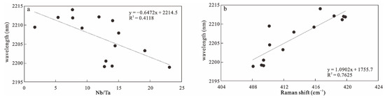 Binary diagram of the SWIR spectra (Pos 2200) for the Shimensi white mica vs. (a) Nb/Ta; (b) Raman shift (Al, O (br)).
