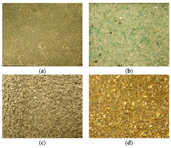 Photographs of the different packing materials: (a) glass beads (GB: 2 mm), (b) glass shards (GS: 4.8–5.6 mm), (c) greywacke (GW: 4.8–5.6 mm), and (d) malachite ore (MO: 4.8–5.6 mm).