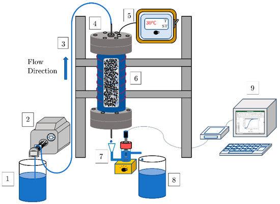 Illustration of the experimental set-up used to conduct tracer tests on the packing materials. It consisted of a (1) 20 L feed tank, (2) peristaltic pump, (3) tubing, (4) cylindrical test column, (5) temperature control unit, (6) heating coils, (7) conductivity measurement cell, (8) 20 L effluent tank, and (9) a desktop computer with data logging software (Graphical Analysis 4).