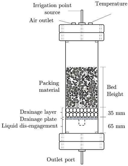 Solution breakthrough time was defined as the time difference between irrigation commencement and the emergence of the first fluid droplets at the bottom of a packed bed. Similarly, the steady-state tracer breakthrough time was defined as the time difference between the commencement of the tracer test and the time at which the first distinct rise in tracer concentration in the bed’s effluent was measured. Liquid hold-up () was defined as the ratio of liquid volume () to total bed volume () in an irrigated packed bed at steady-state, as shown by Equation (2). The 24-h drain-down moisture values were obtained at the end of each tracer test by measuring the volume of solution collected in a 24-h period after irrigation was stopped. It is expressed as a percentage of total liquid hold-up.