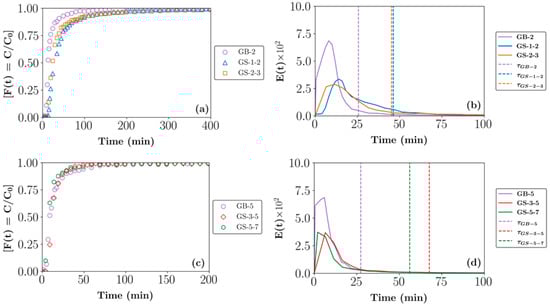 (Left—(a,c)) Cumulative (F(t)) and (right—(b,d)) exit age (E(t)) RTD profiles for beds composed of different size fractions of glass beads (GBs) and glass shards (GSs). Key: GB-2 (2 mm), GB-5 (5 mm), GS-1-2 (1–2 mm), GS-2-3 (2–2.8 mm), GS-3-5 (2.8–4.8 mm), and GS-5-7 (4.8–6.7 mm).