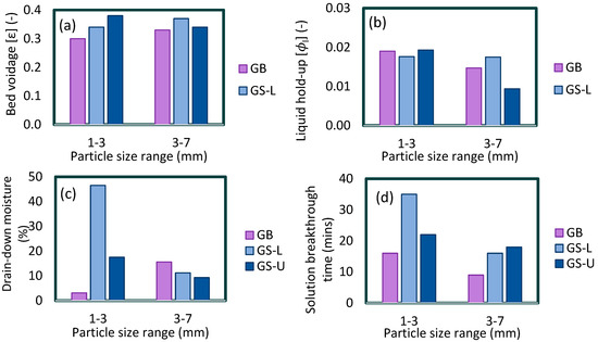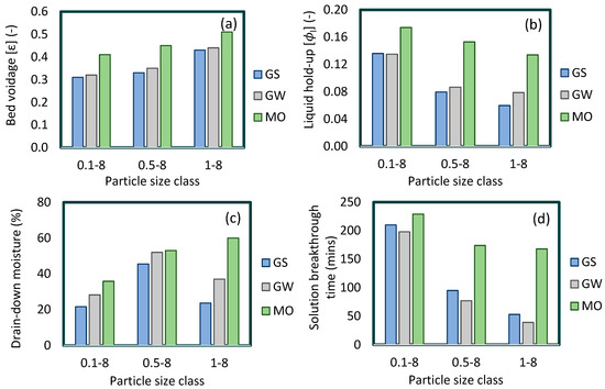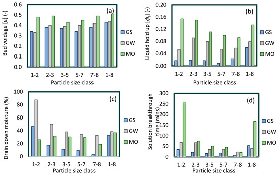(a) Bed voidage, (b) total liquid hold-up, (c) 24-h drain-down moisture, and (d) solution breakthrough time characterisation data for beds composed of different size fractions of GS, GW, and MO.