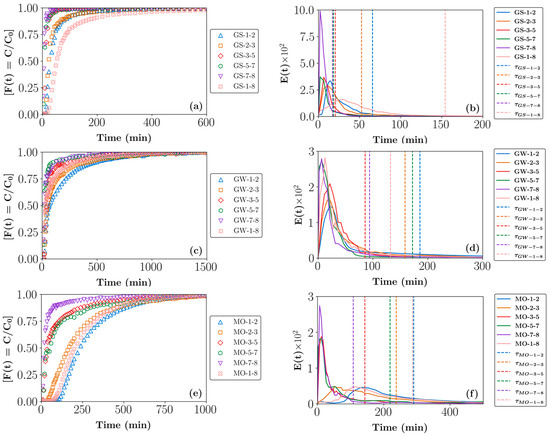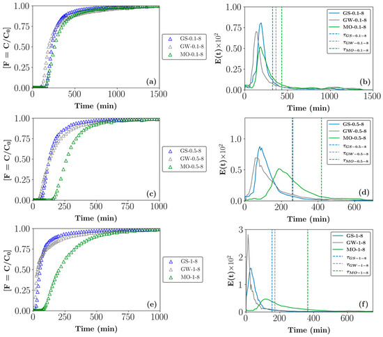 (Left—(a,c,e)) Cumulative (F(t)) and (right—(b,d,f)) exit age (E(t)) RTD profiles for beds composed of different size fractions of GSs, GW, and MO. The vertical lines in the E(t) curves represent the calculated average residence times. Key: GS/GW/MO- 0.1-8 (0.1–8 mm), 0.5-8 (0.5–8 mm), and 1-8 (1–8 mm).