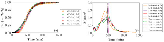 (Left—(a)) Cumulative (F(t)) and (right—(b)) exit age (E(t)) RTD profiles for beds composed of 0-8 mm MO particles and irrigated with different viscosity solutions (0.8. 1.2, 1.6, 1.9, and 2.2 cP). The vertical lines in the E(t) curves represent the calculated average residence times.