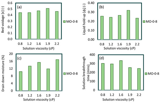 (a) Bed voidage, (b) total liquid hold-up, (c) 24-h drain-down moisture, (d) solution breakthrough time characterisation data for beds composed of 0-8 mm MO particles and irrigated with different viscosity solutions (0.8. 1.2, 1.6, 1.9, and 2.2 cP).