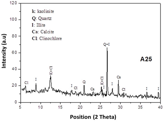 Diffractograms of A25 sample with K—Kaolinite (00-003-0058), Q—Quartz (01-082-0511), I—Illite (00-026-0911), Ca—Calcite (00-002-0629), Cl—Clinochlore (00-029-0701).