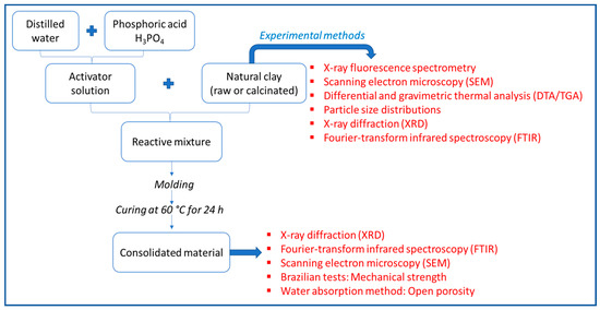 The chemical composition of untreated and treated clay was determined by X-ray fluorescence using a Philips X’unique II instrument. The particle size distributions of untreated and treated clay were measured by laser diffraction (Fritsch analyzer 22 microtec plus). The differential thermal analysis/thermogravimetry (DTA/TGA) analysis was made using Setaram SETSYS Evolution-1750 with a 10 °C/min heating rate from room temperature up to 1200 °C under nitrogen flux. Measurements were carried out on approximately 20 mg of sample mass. The mineral phases were identified by X-ray diffraction measurements of different specimens using a “BRUKER-AXS-D8” type powder diffractometer with CuKα radiation (λkα = 1.5418 Å). A 2θ angle interval of 5 ° to 70 ° was scanned with a speed of 1°/min. High Score Plus software was used to identify the crystallographic phases and to determine the integral intensity of an individual diffraction peak. The Fourier-transform infrared spectroscopy (FTIR) was scanned from 400 to 4000 cm−1 wavenumbers with a resolution of 2 cm−1 using Perkin Elmer spectrum BX spectrophotometer apparatus in transmittance mode. The analysis was carried out on KBr pellets. The Brazilian tests were conducted on geopolymer pellets of 27 mm in diameter and 6 mm in height to measure the diametric compressive strength of phosphoric acid-based geopolymers using a LLOYD LR 50K PLUS universal testing machine with a crosshead speed of 0.2 mm/min. All values of the mechanical strength were equal to the average of the measurement over five tests under the same conditions and were expressed in MPa. Scanning electron microscopy (SEM) was performed using a thermo scientific microscope on broken samples of geopolymeric samples at an accelerating voltage of 10 kV. The fragments were not polished or coated. The open porosity of the geopolymers was determined using the water absorption method. The samples were dried at 100 °C, later immersed in water at room temperature for 24 h, and weighed afterward. The difference between the dry weight and the weight after removing them from the water provided the weight of water in the open pores. Mechanical strength and porosity were measured each time for three specimens and averaged. A summary of the flow sheet of experimental protocol and methods adopted is exhibited in Figure 2.