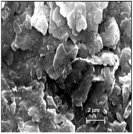 Figure 3 shows the raw clay-based sample microstructure. According to this shot, the A25 clay consisted mainly of fine particles in the form of flat platelets, sometimes in the form of hexagonal, of different sizes, oriented in random directions [15]. This morphology and the particles’ fineness were generally characteristic of clay minerals, such as kaolinite and illite [29], which probably predominate the composition of this clay.