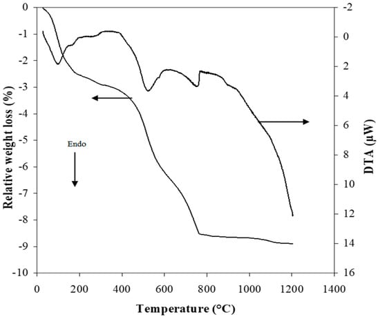 The DTA/TGA thermograms of the clay A25, presented in Figure 4, show several peaks relating to thermal phenomena accompanied sometimes by mass variation. Two endothermic peaks located at 150 °C and 200 °C were accompanied by a loss in mass of 3.5% of the initial mass of the sample. These peaks are related to the release of free water (physiosorbed water) and zeolitic water (interfoliar water) [30]. In addition, an endothermic fluctuation around 300 °C, accompanied by a loss in mass of 0.5%, can be attributed to the dehydroxylation of geothite (FeOOH → Fe2O3 + H2O) [31,32,33], which may be present and responsible for the high Fe2O3 content. The release of the water of constitution linked to the dehydroxylation of kaolinite and its transformation into metakaolin is characterized by an endothermic peak. This peak’s maximum is observed at 533 °C and confirmed by a loss in mass of 2.9%. This mass loss is lower than that expected for pure kaolinite, which is around 14% [34], which confirms the presence of kaolinite in a low amount and of other associated minerals. In addition, another endothermic phenomenon of low intensity and without mass change, observed around 573 °C, is characteristic of the allotropic transition of α-quartz to β-quartz [35]. Finally, a last endothermic peak located at 750 °C corresponds to the decomposition of the calcite with the release of CO2 [16]. This technique confirms once again the presence of calcite in the A25 clay and allows one to identify its decomposition domain. The absence of the exothermic peak around 950 °C, corresponding to the transformation of metakaolinite into mullite, may be due to the low content of kaolinite and the presence of impurities such as iron oxide and calcium carbonate in the A25 clay.