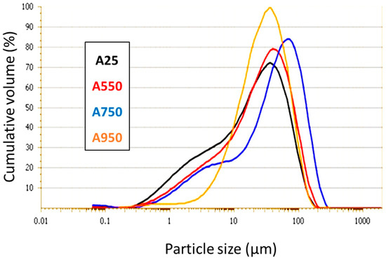 The particle size distribution of raw clay (A25) and calcined ones (A550, A750, and A950) was determined by laser particle sizing, and the obtained results are shown in Figure 5. The treatment of the granulometric distribution results shows that the size of the particles increases with the increase in the temperature of calcination, except at 950 °C, where a decrease is observed. From room temperature to 750 °C, the curves show a bi-modal granulometric distribution, thus indicating the presence of two populations: one relating to the finest clay minerals (centered at approximately 2 µm at 25 °C) and the other centered at approximately 30 µm at 25 °C due to the presence of other phases such as quartz, carbonates, and other associated minerals [40]. The shift of the granulometric distributions of the calcined clay up to 750 °C indicates an increase in the size of the grains following an agglomeration phenomenon. On the other hand, the clay calcined at 950 °C has a single population and a mono-modal distribution. This can be explained by the total disappearance of the fine fraction in favor of the coarse fraction. This behavior can also be justified by the beginning of the sintering phenomenon at this temperature which decreases the size of the formed agglomerates.