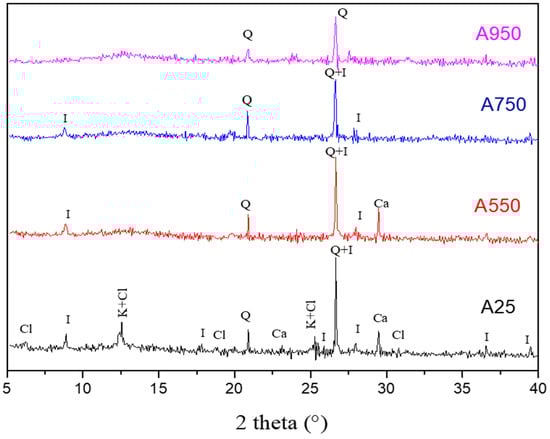 Diffractograms of A25, A550, A750, and A950 samples with K—Kaolinite (00-003-0058), Q—Quartz (01-082-0511), I—Illite (00-026-0911), Ca—Calcite (00-002-0629), Cl—Clinochlore (00-029-0701).