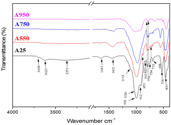 The FTIR spectra corresponding to the raw and calcined clay at different temperatures (550 °C, 750 °C, and 950 °C), in a spectral range between 500 cm−1 and 4000 cm−1, are shown in Figure 7.