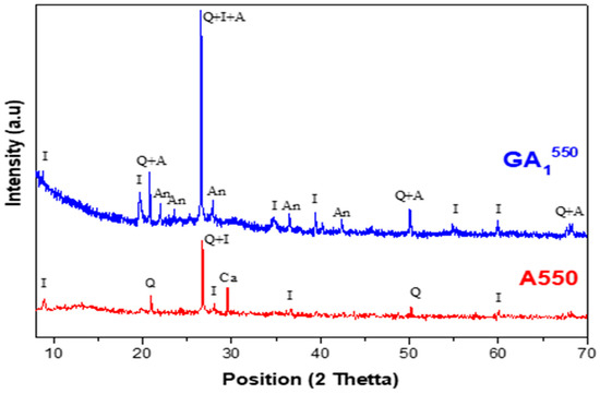 Diffractograms of the GA1550 aged 7 days and A550 clay with Q—Quartz (01-082-0511), I—Illite (00-026-0911), Ca—Calcite (00-002-0629), A—Aluminum phosphate (01-084-0853), An—Anorthite (00-012-0301).