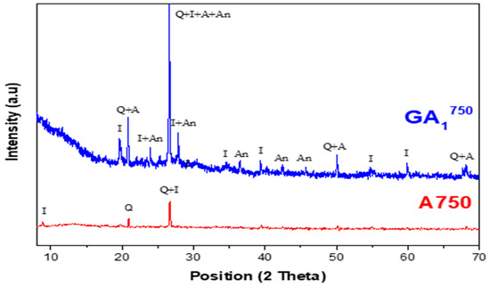 The comparison between the diffractograms of the GA1750 geopolymer and A750 clay (presented in Figure 9) shows the following: