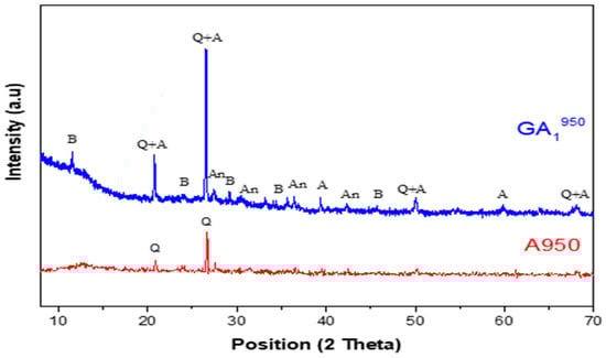 Comparing the obtained geopolymeric sample with its starting corresponding clay (A550), the diffractogram of the GA1550 geopolymer, presented in Figure 8, shows the following: