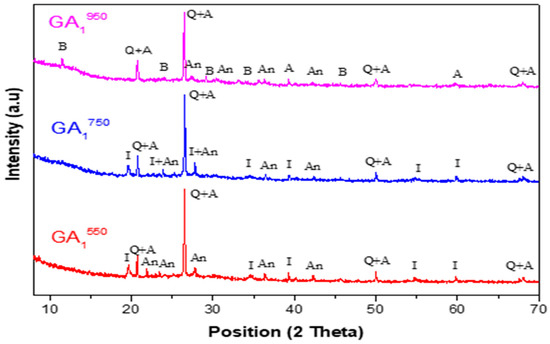 The results of X-ray diffraction analysis of A25 raw clay and calcined ones at different temperatures (550 °C, 750 °C, and 950 °C) are shown in Figure 6.