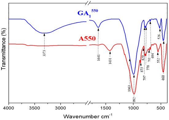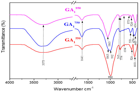 The shoulder observed at 1063 cm−1 for GA1550 was further developed to give a more intense and brighter shoulder in the GA1750 spectrum, as shown in Figure 15. This can be explained by the increase in the concentration of GA1750 in aluminum phosphate compounds. Indeed, by increasing from 550 °C to 750 °C, more reactive metakaolin is formed, which is the main precursor in the geopolymerization reaction to form new compounds. This is further justified by the appearance of a band located at (478 cm−1), which is attributed to the vibration mode of PO4 groups observed in the aluminum phosphate [49]. In addition, the spectrum of GA1750 shows the appearance of new bands located around (445 cm−1 and 551 cm−1), which are attributed to an anorthite compound [50]. Thus, this phase is increasingly favored by increasing the calcination temperature from 550 °C to 750 °C, which can be clearly observed in Figure 15. The characteristic bands (694 cm−1, 778 cm−1, and 797 cm−1) of quartz and illite persist. These phases still seem to be inert to phosphoric acid, even at 750 °C. Moreover, we observe the persistence of the two bands observed towards 3373 cm−1 and 1641 cm−1; they are attributed to the modes of vibrations, elongation, and deformation of the groups (O–H) coming from the phosphoric acid [48] and to the vibrations of the water molecules (H–O–H), respectively.