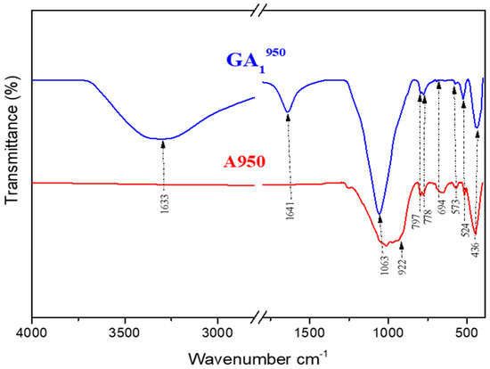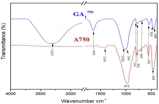 The spectrum of the GA1750 geopolymer compared with that of the clay calcined at 750 °C (Figure 13) shows the following: