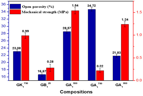 The examination of these results shows that the highest mechanical strength corresponds to that of the GA1550 sample (despite the presence of high open porosity), and the lowest one corresponds to that of GA1750. By linking these results with those of the previous analyses, we can deduce the following: