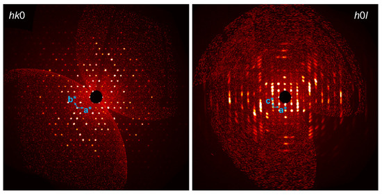 Reconstructed precession images of hk0 and h0l reciprocal lattice layers of the studied crystal.