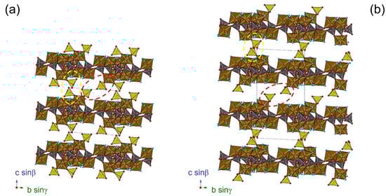 Comparison between the c ~ 10.8 Å (a) and c ~ 21.6 Å (b) crystal structure of bohuslavite, seen down a. Brown, dark grey, and yellow polyhedra are Fe-, P-, and S-centered. Red and light blue circles represent O2- and [H2O,(OH)-] groups. Interlayer H2O groups are not shown.