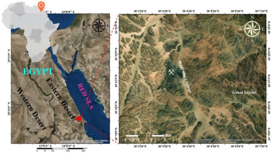 According to Figure 1, the Abu Ghalaga area is located in at the south-eastern desert, Egypt, 100 km south of Mersa-Alam City and 17 km west of the Abu Ghosoun port on the Red Sea Coast. It represents a part of the Neoproterozoic Nubian Shield in NE Africa. The study covers approximately 268 km2 and is situated between latitudes 24°15′35″ and 24° 25′35″ N and longitudes 35°17′25″ and 35°12′01″ E.