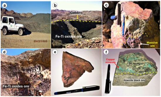 Field relationships between the Fe-Ti oxides bodies and their host rocks. (a) Abu Ghalaga mine. (b) Black (fresh) ore and red (oxidized) ore hosted in the gabbroic rocks. (c) Massive ore. (d) and (e) Black (fresh) ore and red (oxidized) ore. (f) Green copper mineral staining along the boundaries of ilmenite ore.