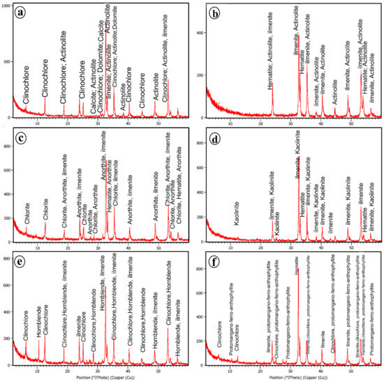XDR patterns of Fe-Ti oxides bearing gabbroic rocks showing the following minerals: (a) chlinochlore, actinolite, calcite, dolomite; (b) hematite, ilmenite, actinolite; (c) chlorite, anorthite, ilmenite, hematite; (d) kaolinite, ilmenite, hematite; (e) clinochlore, hornblende, ilmenite; (f) clinochlore, ilmenite, hematite, protomangano-ferro-anthophyllite.