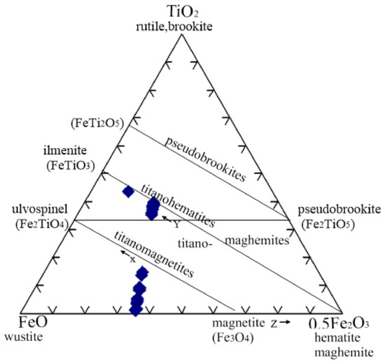 Ternary system of TiO2-FeO-1/2Fe2O3 [30] showing the titano-magnetite and titano-hematite–hemoilmenite solid-solution lines and the titano-maghemite composition.