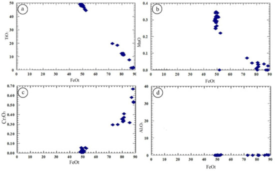 The plotted samples on the TiO2-FeO-Fe2O3 ternary diagram [29] reveal that the studied Fe-Ti oxides are related to ilmenite–hematite series and ulvöspinel–magnetite series (Figure 10). The Fe-Ti oxide minerals from gabbroic rocks exhibit a significant negative correlation of TiO2, MnO, and Al2O3 with FeO, while it shows a positive correlation with Cr2O3 (Figure 11). Iron–titanium oxides represented by magnetite, and hematite exsolutions occur as irregular aggregates (Figure 12). Rutile forms an intergrowth as a secondary phase by oxidation, most probably as post-ore formation.