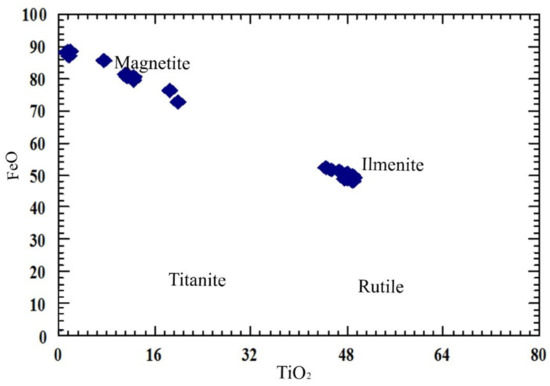 FeO (wt.%) versus TiO2 (wt.%) variation diagram showing the chemical constituents of the studied minerals [24].