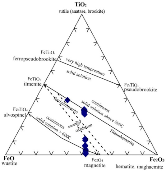 - Buddington, A.F.; Lindsley, D.H. Iron- titanium oxide minerals and synthetic equivalent. J. Petrol. 1964, 5, 310–357. [Google Scholar] [CrossRef]