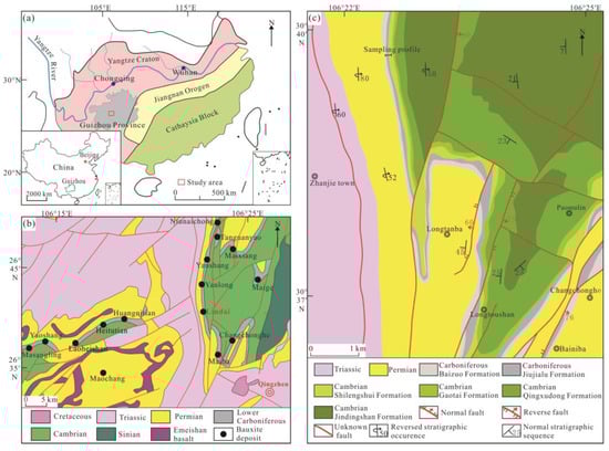 Geotectonically, central Guizhou is positioned on the southwestern border of the Yangtze Craton of the South China Block (Figure 1a). This area has been a stable passive continental margin since the late Sinian period, forming a set of thick sedimentary formations dominated by marine carbonate rock intercalated with fine detrital rock during the Cambrian period [30]. At the end of the Ordovician period, the Caledonian Movement resulted in the exposure of Cambrian and Ordovician stratigraphic units in central Guizhou, forming the Qianzhong Uplift [31]. Subsequently, after nearly 100 million years of large-scale weathering and erosion, central Guizhou became a karstic plain at the end of the Devonian period [23]. Central Guizhou had karstic depressions and lakes during the Carboniferous Visean age due to the large-scale transgression of the South China Sea from south to north [23]. During this time, the primary bauxitic materials weathered from the underlying bedrock were transported into these karst landforms, depositing a set of ore-bearing rock series in the Lower Carboniferous Jiujialu Formation [28].