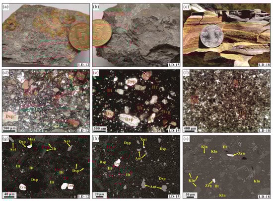 Hand-specimen, microscopical, and SEM backscattered electron (BSE) photographs of the representative bauxite ore and bauxitic claystone samples of the Lindai bauxite deposit. (a) Gray clastic bauxite ore of the LD-12 sample (modified from [28]). (b) Gray compact bauxite ore of the LD-15 sample. (c) Gray black laminated bauxitic claystone of the LD-18 sample (modified from [28]). (d) Matrix-supported clastic texture in the LD-12 sample (plane-polarized light). (e) Matrix-supported pisolitic texture in the LD-15 sample (plane-polarized light). (f) Pelitomorphic texture in the LD-18 sample (cross-polarized light). (g) Diaspore, illite, anatase, zircon, and monazite in the LD-12 sample. (h) Diaspore, illite, anatase, zircon, and xenotime in the LD-15 sample. (i) Granular kaolinite, illite, and zircon are scattered in the kaolinic matrix in the LD-18 sample. Abbreviations: Dsp = diaspore, Ilt = illite, Ant = anatase, Zrn = zircon, Kln = kaolinite, Mnz = monazite, Xnt = xenotime.